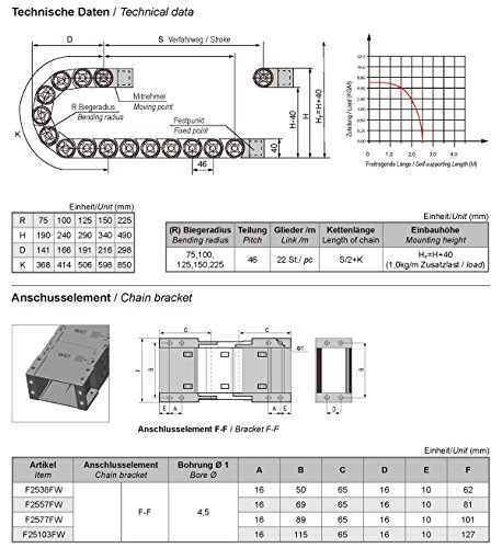 Jflo 1 m, catena energetico 25 X 57 mm R75, JN2557FW, con coperchio/Chiusa, su entrambi i lati di aprire - Catena di traino - Cavo Guida - Guida catena energetica, Nero,