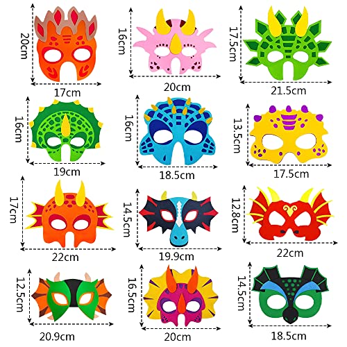 【Contenuto del set】 Il set include 12 diversi modelli di maschere di dinosauro in feltro, non facili da strappare, riutilizzabili e la dimensione è di circa 7,8 "* 6,5".