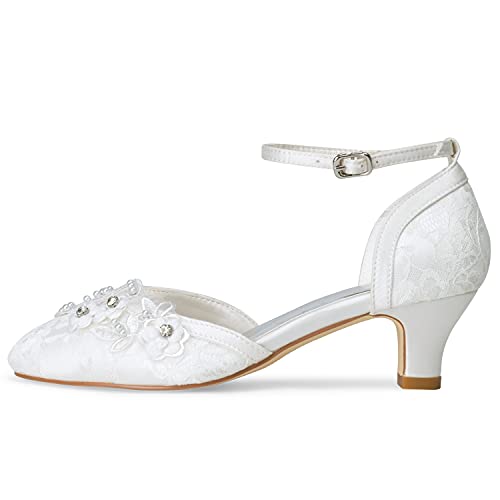 JIAJIA 009611 Scarpe da Sposa da Donna Punta Chiusa 5cm Scarpe da Sposa con Strass con Tacco Medio e Tacco a Punta in Raso Colore Avorio, Taglia 42 EU