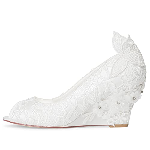 JIAJIA 1217525 Scarpe da Sposa da Donna Punta Aperta 7,5 cm Scarpe con Tacco a Zeppa in Raso di Pizzo Scarpe da Sposa con Strass Colore Avorio, Taglia 38 EU
