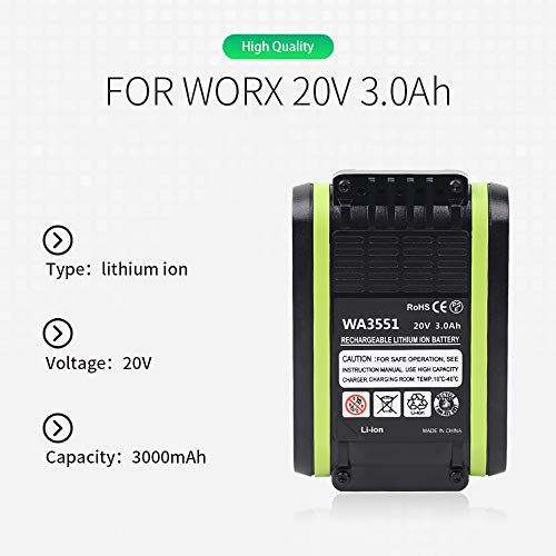 Tipo di batteria: Li-ion || Voltaggio: 20V || Capacità: 3000mAh || Batteria sostitutiva per Worx WA3551 || Realizzato con 18650 celle di alta qualità