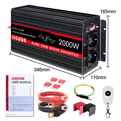 JIGUUN 2000W inverter onda sinusoidale pura 24V 220V 230V invertitore Convertitore Potenza di picco 4000W con Telecomando Senza Fili telecomando con 2 EU Presa con Uscita USB per RV Truck tifone...