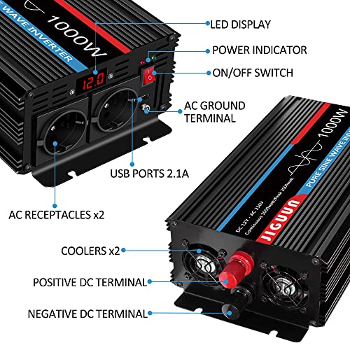 JIGUUN Inverter onda pura 12v 220/230V 1000W Trasformatore con 2 prese EU e 1 porta USB 2.1A - Telecomando senza fili e display LED Potenza di picco 2000W per camion camper emergenza