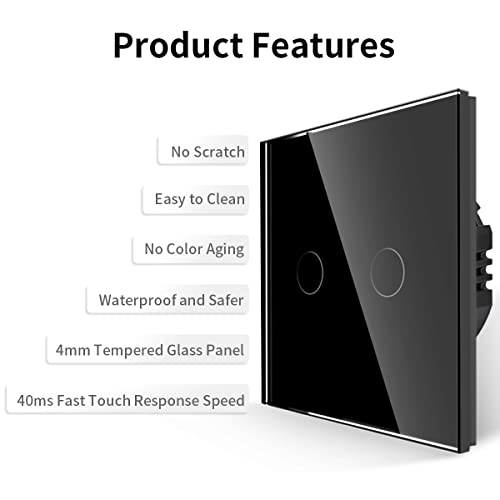 JIMEIDA Interruttore della luce unipolare, nessun cavo neutro richiesto, interruttore di controllo touch con pannello in vetro nero, 2 bande 1way, AC 240V 500W/Gang