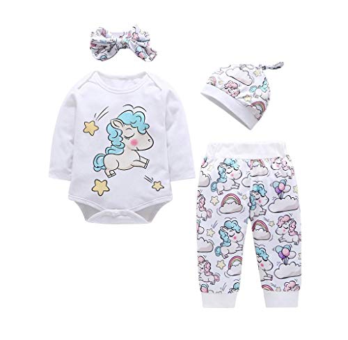 Jimmackey 4 PCS Bambina Completini Cartone Animato Stampato Neonata Pagliaccetto + Pantaloni + +Cappello + Headband Prima Infanzia Abbigliamento