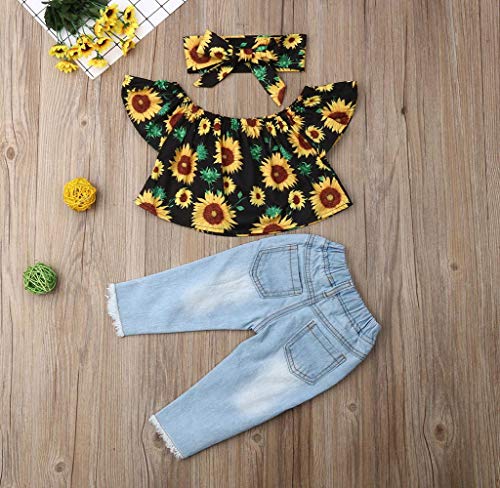 Jimmackey Neonata Bambine off Spalla Falbala Cime Girasoli Stampa Camicia + Buco Denim Pant Fascia Bambino Vestiti Set