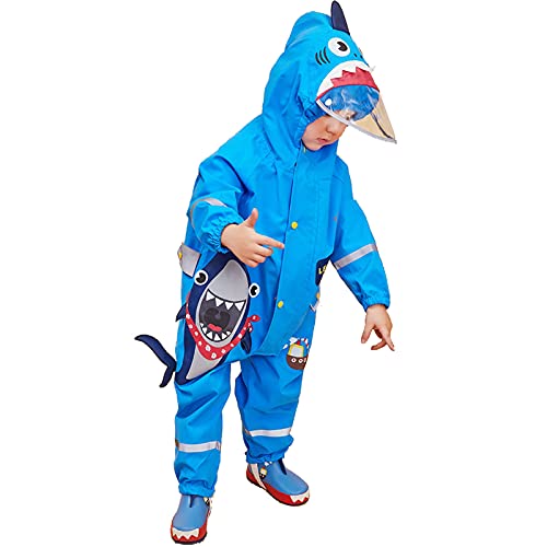 JinBei Impermeabile Bambini Antipioggia Giacca Tuta Bambino con Cappuccio Blu 3D Squalo Pioggia Cappotto Traspirante Leggero con Striscia Riflettente Poncho per Ragazzo Cerniera 2-4 Anni