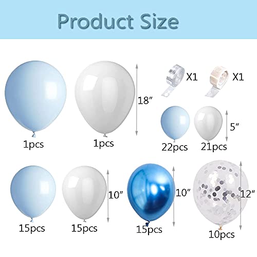 【Arco Ghirlanda Di Palloncini Blu】22 palloncini azzurri da 5 pollici, 21 palloncini in lattice bianco da 5 pollici, 5 palloncini con paillettes argento da 5 pollici, 15 palloncini azzurri da 10 pollici, 15 palloncini in lattice bianco da 10 pollici, 10 palloncini con paillettes argento da 12 pollici, 15 palloncini blu metallizzato da 10 pollici, 1 palloncino azzurri da 18 pollici, 1 palloncino in lattice bianco da 18 pollici, 1 rotolo di colla, 1 rotolo di catena di palloncini da 5 m.