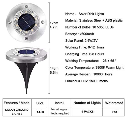 Jingxinxin 10 luci a LED a disco solare, illuminazione per vialetti, luci impermeabili IP65, adatte per giardino, passerella, prato, recinzioni delle scale, paesaggio, sentiero, ponti (4 confezioni da