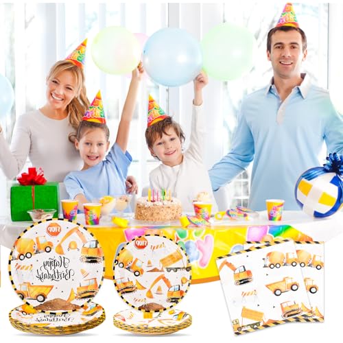 Jinlaili 75PCS Decorazione di compleanno escavatore, Stoviglie per veicoli da costruzione, Decorazioni per Feste di Costruzione di Piatti Carta Tovaglioli, Escavatori Set di Stoviglie per 25 Ospiti