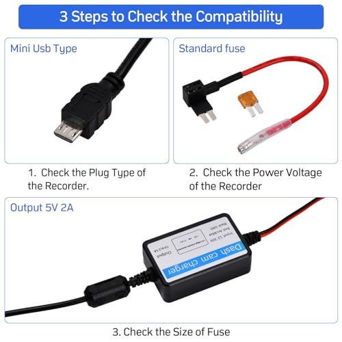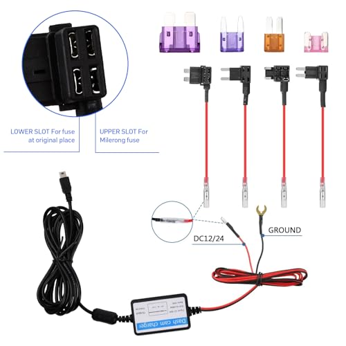 ● 【Ampia compatibilità】 Ingresso: 12 V-30 V, Uscita: 5 V/2 A. Questo kit cablaggio di tipo C è compatibile con un'ampia gamma di dash cam, DVR per auto, navigatori GPS, rilevatori radar e altro ancora. Inoltre viene fornito con 4 tipi di connettori per fusibili, Mini, ACS, ATO e Micro2, adatti per la maggior parte delle auto.