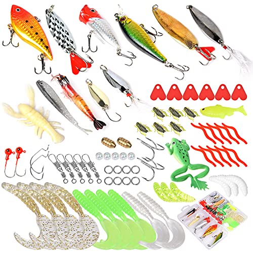 【78 Pezzi di Esche da Pesca Miste】Il kit di esche da pesca include esche dure, esche morbide, vermi, esche a cucchiaio metsal, ganci a manovella, ganci tripli, girelle, perline, anelli divisi, ecc