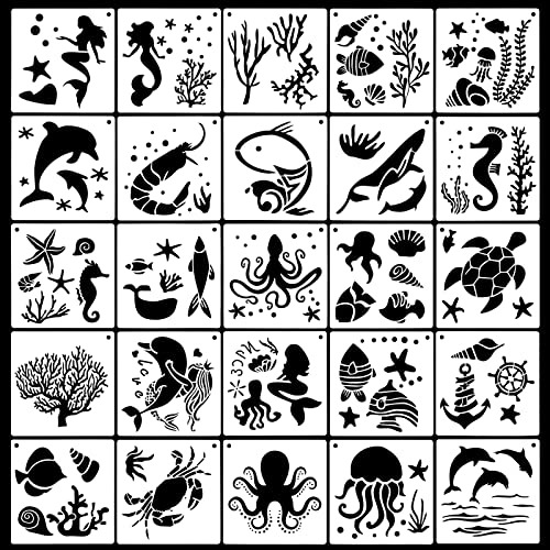 Jinlaili 25 Pezzi Stencil per Pittura di Creature Marine, Stencil di Animali Marini Riutilizzabili, Cartoni Animati Stencil per Bambini, Stencil da Disegno in Plastica, per Scrapbooking Fai da Te