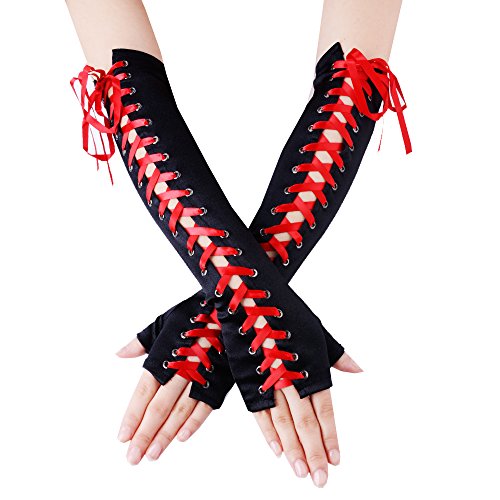JISEN - Guanti senza dita da donna, al gomito, con lacci, stile steampunk, per travestimenti, scaldabraccia, Rosso satinato., Etichettalia unica