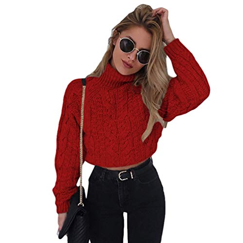 Jitong Maglione Corto Donna a Trecce, Manica Lunga Maglioni Collo Alto, Maglioncino Dolcevita Invernale (Rosso, Asia M)