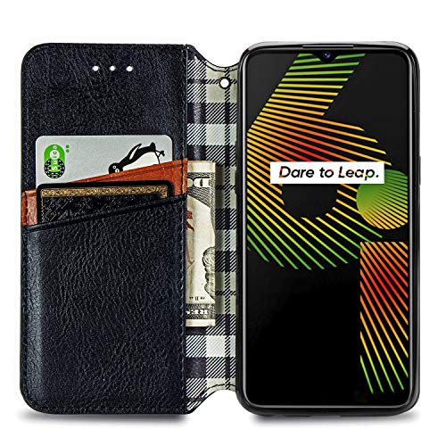 JIUNINE Cover OPPO Realme 5 / 5i, Custodia Cover a Libro in Pelle Portafoglio Flip Caso Antiurto con Motivo a Losanga 3D [Porta Carte] [Adsorbimento Magnetico] per OPPO Realme C3 / 6i, Nero