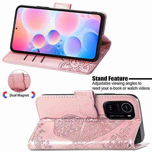 JIUNINE Cover Xiaomi Poco F3 5G / Xiaomi Mi 11i, Custodia Libro in Pelle Portafoglio Case Flip Antiurto con Disegni di Farfalla [Porta Carte] [Magnetica] per Xiaomi Poco F3 5G, Oro rosa