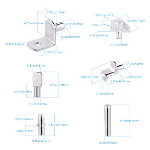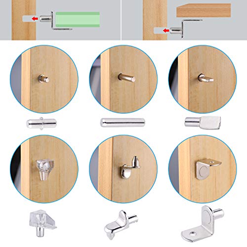 【6 tipi di opzioni】 Il pacchetto comprende 6 stili di mensole e supporti per scaffali, totalmente 130pz di perni di supporto. Ci sono i perni di supporto corti, i perni lunghi, le mensole a forma di L e i perni a forma di cucchiaio. Il prezioso set soddisfa le vostre diverse esigenze.