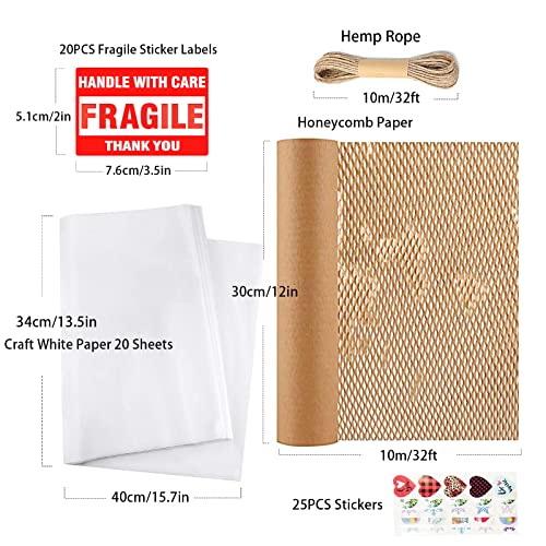 JJWNMLL Carta a Nido d'Ape Carta da imballaggio 30cm x10m, Confezione Protettiva Ecologica Carta per Articoli Trasporto Materiale di Imbottitura,Corda di Canapa da10m Adesivi, Carta Velina Bianca