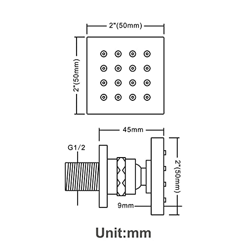 ▶ Bellissimo design quadrato: lo spruzzo del corpo è diametro viso a spruzzo 5 × 5 cm, design quadrato incredibile. Ed è una connessione G1 / 2 ". Montaggio a parete, facile da installare