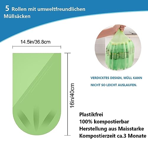 100 sacchetti organici per la rottura: il punto di rottura impedisce che si strappi durante la rimozione dei sacchetti. Angoli forti, a prova di perdite e forature. Una confezione da 100 bustine (20 x 5 rotoli) è sufficiente per una famiglia tre volte al giorno per un mese.