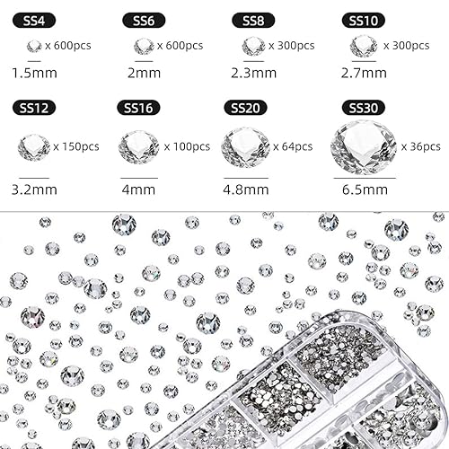 Diverse dimensioni e quantità: il set comprende 8 diverse dimensioni di pietre di cristallo: 1,5 mm (SS4, totale 600 pezzi), 2 mm (SS6, totale 600 pezzi), 2,5 mm (SS8, totale 300 pezzi), 2,9 mm (SS10, totale 300 pezzi) ), 3,2 mm (SS12, totale 150 pezzi), 4 mm (SS16, totale 100 pezzi), 4,6 mm (SS20, totale 64 pezzi), 4,8 mm (SS30, totale 36 pezzi). ).
