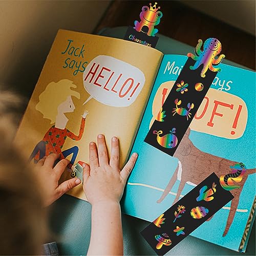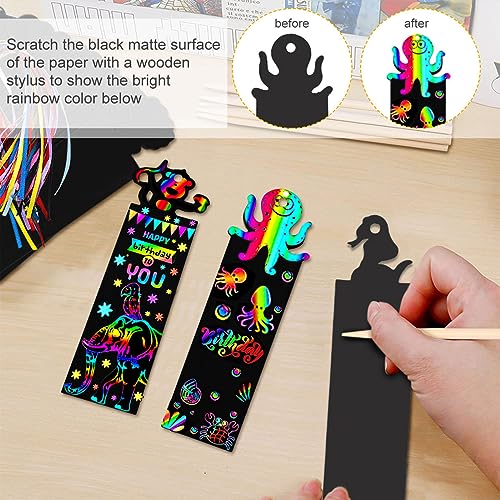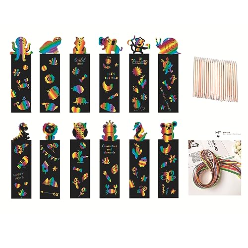 JOCXZI Scratch Art Bambini,Set di Segnalibri Arcobaleno per Bambini,Segnalibro Scratch Animali, con Corde Colorate e Penna in Legno per Forniture Artigianali(48 Pezzi)