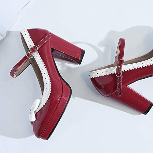 JOEupin Donna Carino Lolita Cosplay Scarpe Fiocco Tacco medio Grosso Mary Jane Pumps, Rosso, 43 EU