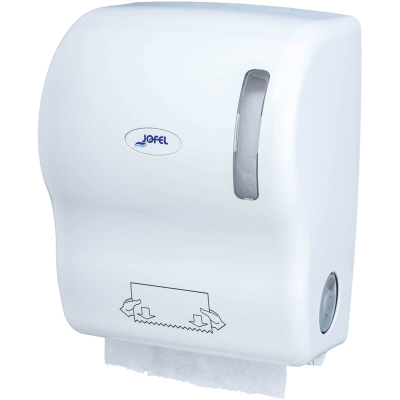 Autocut carta asciugamano dispenser. Realizzato interamente in ABS bianco, alta qualità e resistenza. Blocco tasti, indicatore di livello e coperchio incernierato. 210 millimetri. massimo Diametro del rotolo, fornisce pretagliato asciugamani, uno alla volta, 28 cm di lunghezza ciascuno. Tecnologia di ultima generazione per costi ridotti e consumi. Senza leva, con manico, batteria o alimentazione necessaria. Interno taglierina per carta precutting è realizzato interamente in acciaio, ed è protetta in modo che non possa essere accessibile dall' esterno. Funzionamento manuale di carta, in esclusiva. Ricarica facile e veloce. Semplice funzionamento del meccanismo interno, facilmente accessibile. Pull senza problemi, la carta per Autocut. piccole ruote collocate su entrambi i lati alla guida sempre garantire la fornitura di carta e carta.