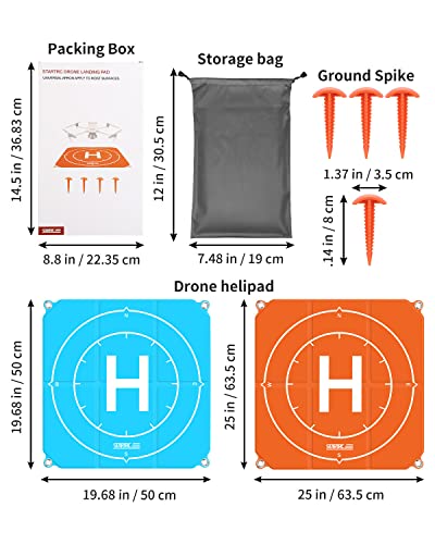 【Portatile e facile da piegare】portatile pieghevole landing pad: 21,6 x 21,6 pollici (55 x 55 cm), facile da piegare, così puoi portarlo ovunque. Il design bicolore su entrambi i lati mette in evidenza la posizione del drone, aiuta il tuo drone a trovare il suo posto più facilmente ed è abbastanza forte da essere utilizzato su sabbia, erba ricoperta di vegetazione, strade sterrate irregolari o neve.