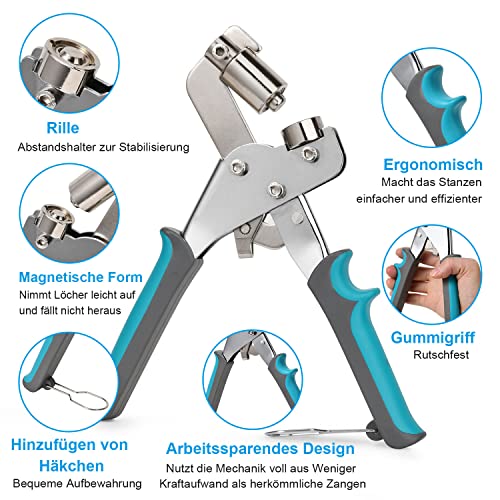 Aggiornamento del modello di eyelet pliers - Aggiornato palmare con tecnologia innovativa di livello e aspirazione magnetica, risparmia tempo e effort e aumenta l'efficienza del 20% rispetto all'originale. Con la forza magnetica, gli occhielli e le rondelle possono essere fissati e tenuti saldamente senza cadere durante il processo di lavoro.