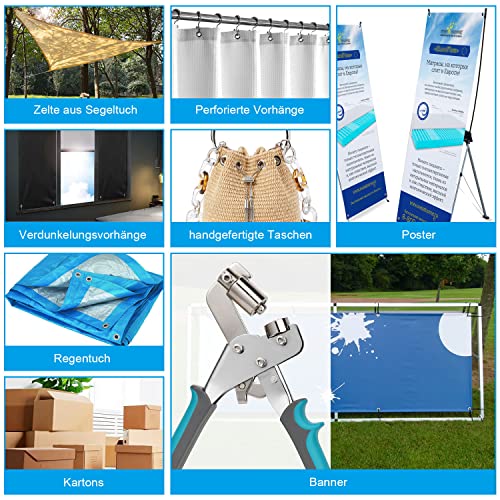Ampio campo di applicazione: la pinza per beccucci è facile da usare e facile da perforare. Ampia gamma di applicazioni come tela, teloni, borse intrecciate, striscioni, cartone, tessuti, tessuto non tessuto, tessuto, poster in pelle, asciugamani, tende oscuranti, striscioni in PVC, teloni, tende, piscine e camion, anche per decorare vestiti, borse, scarpe, cinture, portafogli e altri lavori artigianali.