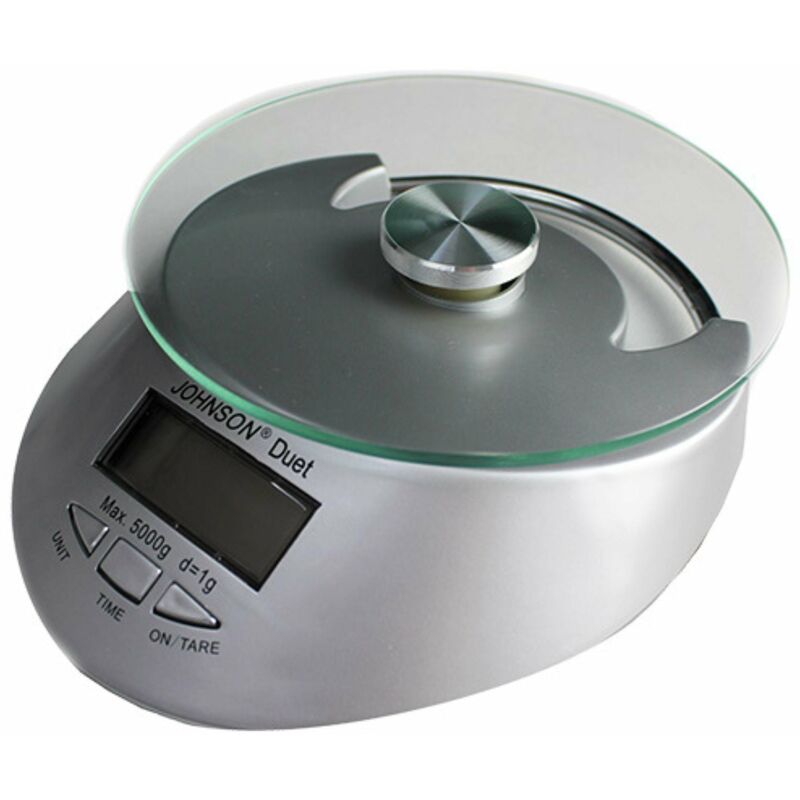 Johnson Bilancia da cucina Duet 5kg DUET, la bilancia da cucina di Johnson, è dotata di sensore da alta precisione, divisione di 1g, con una portata massima di 5000 g. È leggera e molto piccola, sta ovunque. Il piatto di appoggio in vetro è facilissimo da avvitare e svitare per la pulizia, la colorazione argento la rende elegante per ogni tipo di cucina. Il pulsante di accensione/tara è ben accessibile e facile da attivare, il display è grande e ben visibile e a bilancia spenta segna l'ora. La confezione include una batteria. Caratteristiche: Bilancia digitale da cucina Funzione tara Piatto in vetro removibile Portata 5 Kg Graduazione 1g Doppia scala, grammi/once Indicatore di sovraccarico Indicatore di batterie scariche Spegnimento automatico o manuale Orologio h/min Alimentazione: DC 3V Batteria 1 x 3V (CR2032)