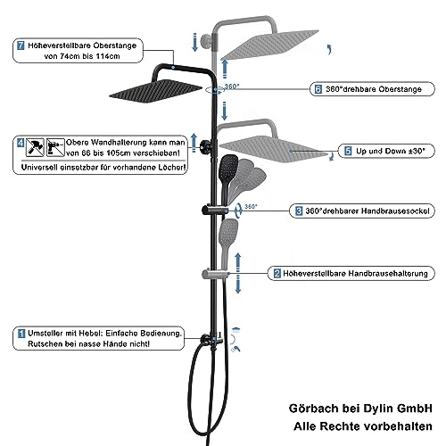 【Colonna doccia regolabile】1. Supporto da parete superiore regolabile, universale per fori esistenti,senza forare o danneggiare le piastrelle. 2.L'altezza dell'asta doccia può essere regolata tra 74~114cm.