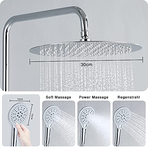 JOHO 304 Colonna Doccia senza Miscelatore in Acciaio Inox 304 Cromato Set Doccia a Pioggia con Soffione e Doccetta a Mano (D30cm tondo)