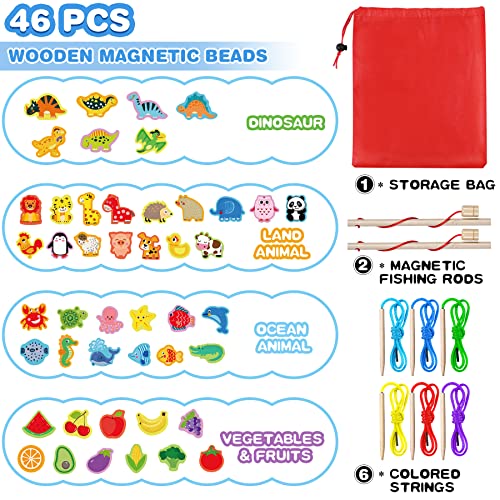 Jojoin 46 PCS Giochi da Infilare per Bambini - 2 in 1 Giochi Montessori Magnetici di Pesca in Legno | Frutta Verdura Animali Perline di Legno - Giocattoli Educativi Compleanno Bambino 3+ Anni