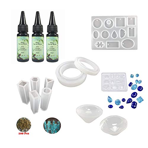 Joligel Kit Resina Epossidica UV Rapida Trasparente per Gioielli, 3 Epossidica 30ml 11 Stampi silicone 3D (31 forme) diamanti/orecchini/bracciali/gemme 100 Anelli d'oro per ciondoli collane