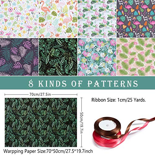 In totale 8 fogli di carta da regalo vengono forniti con 2 rotoli di nastri di raso, tema del fenicottero della foresta pluviale tropicale con 8 design diversi, scelta di varietà per soddisfare le diverse esigenze di imballaggio.