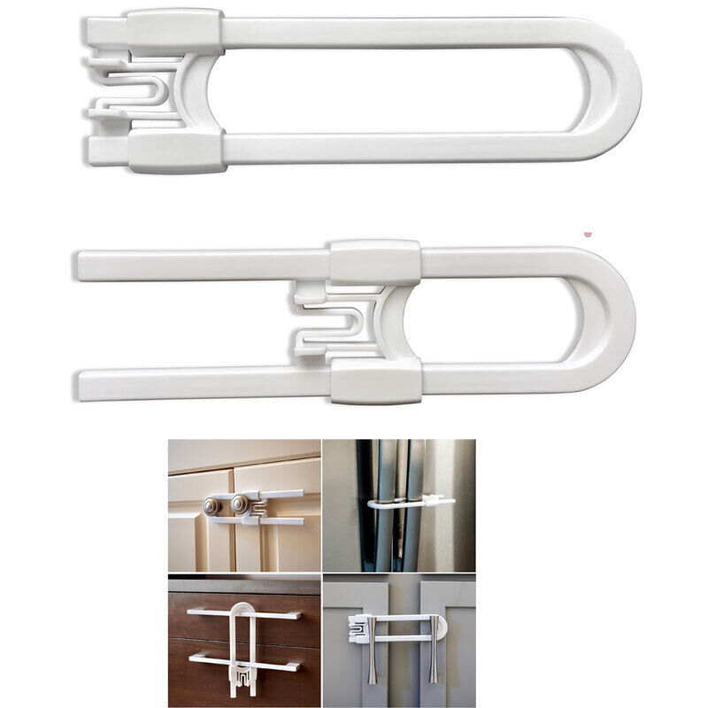 Chiusura Scorrevole armadi per bambini 2 pz DY51064 La Chiusura Scorrevole per Armadi modello DY51064 è un set di due dispositivi di sicurezza progettati per prevenire che i bambini aprano armadi e cassetti. Queste chiusure sono caratterizzate da un design intelligente e funzionale che si adatta a vari tipi di ante, sia scorrevoli che a battente. Nelle immagini, si osservano i due pezzi della chiusura in dettaglio e diversi esempi di come possono essere applicati sugli armadi o più in generale sulle ante dotate di maniglie o pomoli. La chiusura è composta da una barra lunga con una sezione curva all'estremità che si incastra in tra le maniglie o pomoli. Il meccanismo di chiusura è semplice ma efficace: la barra scorre dentro e fuori dal supporto, rendendo l'operazione di apertura e chiusura semplice per un adulto ma difficile per un bambino. Il colore bianco neutro delle chiusure le rende versatili e discretamente integrabili in quasi ogni ambiente domestico. La plastica dura e