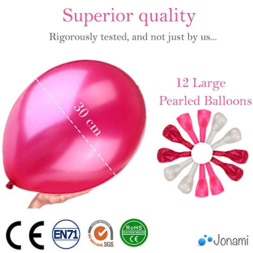 Jonami Decorazione Compleanno Bimba. Bandierine di Buon Compleanno “Happy Birthday” + Set di 8 Pompon a Fiore + 2 Festoni con Stelle di 3 m + 12 Palloncini Perlati Rosa Bianco Fucsia.
