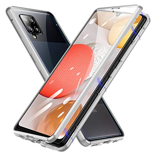 Jonwelsy Cover per Samsung Galaxy A42, Adsorbimento Magnetico Paraurti in Metallo con 360 Gradi Protezione Case Doppi Lati Trasparente Vetro Temperato Flip Custodia per Samsung Galaxy A42 (Argento)