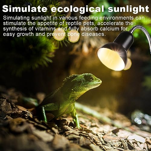 【Luce solare simulata】Lampada Tartarughe fornisce luce UVB a onde lunghe di alta qualità con elevata penetrazione e basso assorbimento. Lampada Tartarughe simula l'intero spettro del sole, che può promuovere uno sviluppo osseo sano nei rettili, mantenere i rettili caldi e contiene una piccola quantità di UVA per stimolare l'appetito e UVB per promuovere la sintesi di vitamina D3 e l'assorbimento del calcio.