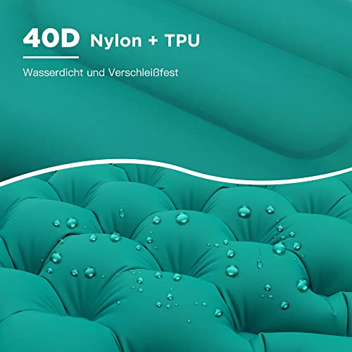 【Impermeabile e resistente all'usura】 Il nostro materassino è realizzato in nylon avanzato e strato di TPU impermeabile. Il vantaggio di questo materiale è resistente all'usura, all'umidità, ultraleggero e resistente agli schizzi. Il materasso ad aria autogonfiabile ha un design ergonomico della trama sulla superficie, che aiuta le persone a dormire bene la notte.