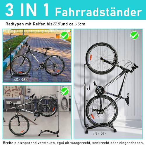 Cavalletto per bicicletta 3 in 1: con il supporto per ruote è possibile utilizzare tutti i tipi di ruote da 20 a 27.5 pollici, sia in orizzontale, verticale che in verticale. Include mountain bike, bici da strada, biciclette per bambini e molto altro ancora. In questo modo il supporto è ideale per interni ed esterni.