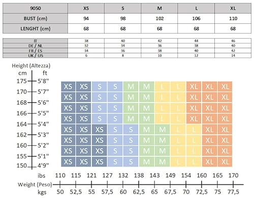 Taglie disponibili: XS veste circa una 38 italiana, S veste circa una 40 italiana, M veste circa una 42 italiana, L veste circa una 44 italiana, XL veste circa una 46 italiana,2XL veste circa una 48 italiana.