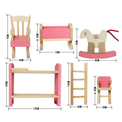 Jorzer Casa in Legno in Miniatura Mobili Set, Rosa Bambole Giocattolo di Legno Include Letto a Castello Sedia Culla dei Bambini del Capretto Regalo Casa delle Bambole Mini Mobili Giocattolo