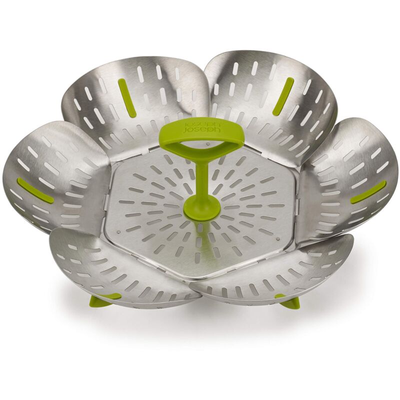 Questo grande cestello pieghevole per la cottura a vapore è prodotto in resistente acciaio inossidabile, ha lati autoregolanti, piedini in silicone resistenti al calore e alette laterali in silicone, si solleva facilmente grazie al pratico manico, completamente aperto è molto capiente, richiuso, occupa pochissimo spazio. è ideale sia per pentole antiaderenti sia in acciaio inossidabile.