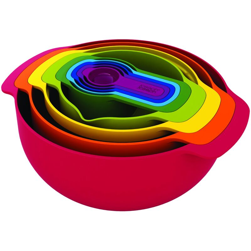 Nest è l'incredibile collezione di utensili da cucina salvaspazio. Il design unico consente di impilare ordinatamente i singoli elementi di ogni set in modo da ridurre al minimo lo spazio occupato. Questo design funzionale e unico prevede per ciascuna terrina una base ampia anti-scivolo e comode impugnature. La terrina piccola è graduata internamente (ml/fl.oz) per una maggiore praticità e presenta un beccuccio per versare con precisione il contenuto. Le tazze dosatrici sono state progettate per agganciarsi tra loro in modo sicuro e consentire l'esecuzione di misurazioni da 1 cucchiaino (5 ml) fino a 1 tazza (250 ml). Un colino a rete in acciaio inox e un ampio scolapasta completano la collezione degli articoli per la preparazione degli alimenti.