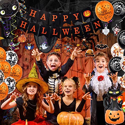 【Ricco set di decorazioni di Halloween】 22 * palloncini in lattice (11 * arancio, 11 * nero), 12 * palloncini di coriandoli (6 * arancio, 6 * nero), 2 * palloncini di alluminio (1 * ragno, 1 * palloncini di zucca), 12 ornamenti a spirale di carta, 1 * Banner, 100 g di cotone ragno bianco + 20 ragni, ragnatela nera 2,15 × 2 metri, fantastiche decorazioni per le tue feste, aggiungi più atmosfera da festival.
