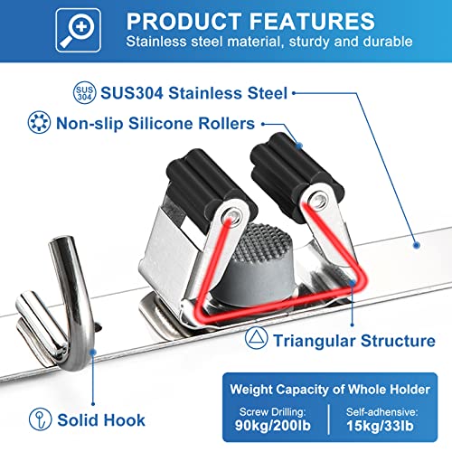 JOTOL Porta Scope Parete,2 Pezzi Portascope da Muro,con 3 Supporti e 4 Ganci per Cucina,in Acciaio Inox,Autoadesivi,per Attrezzi da Giardino, Porta Scope e Gancio Scopa Muro